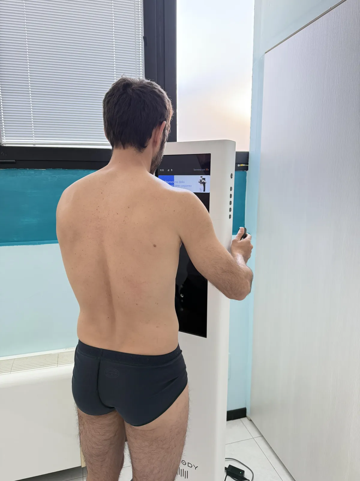 Il nostro percorso inizia con un Body Scanner 3D unico a Bologna. A differenza della semplice bilancia, questa tecnologia crea un avatar millimetrico della tua figura, analizzando volumi, circonferenze e postura in pochi secondi.